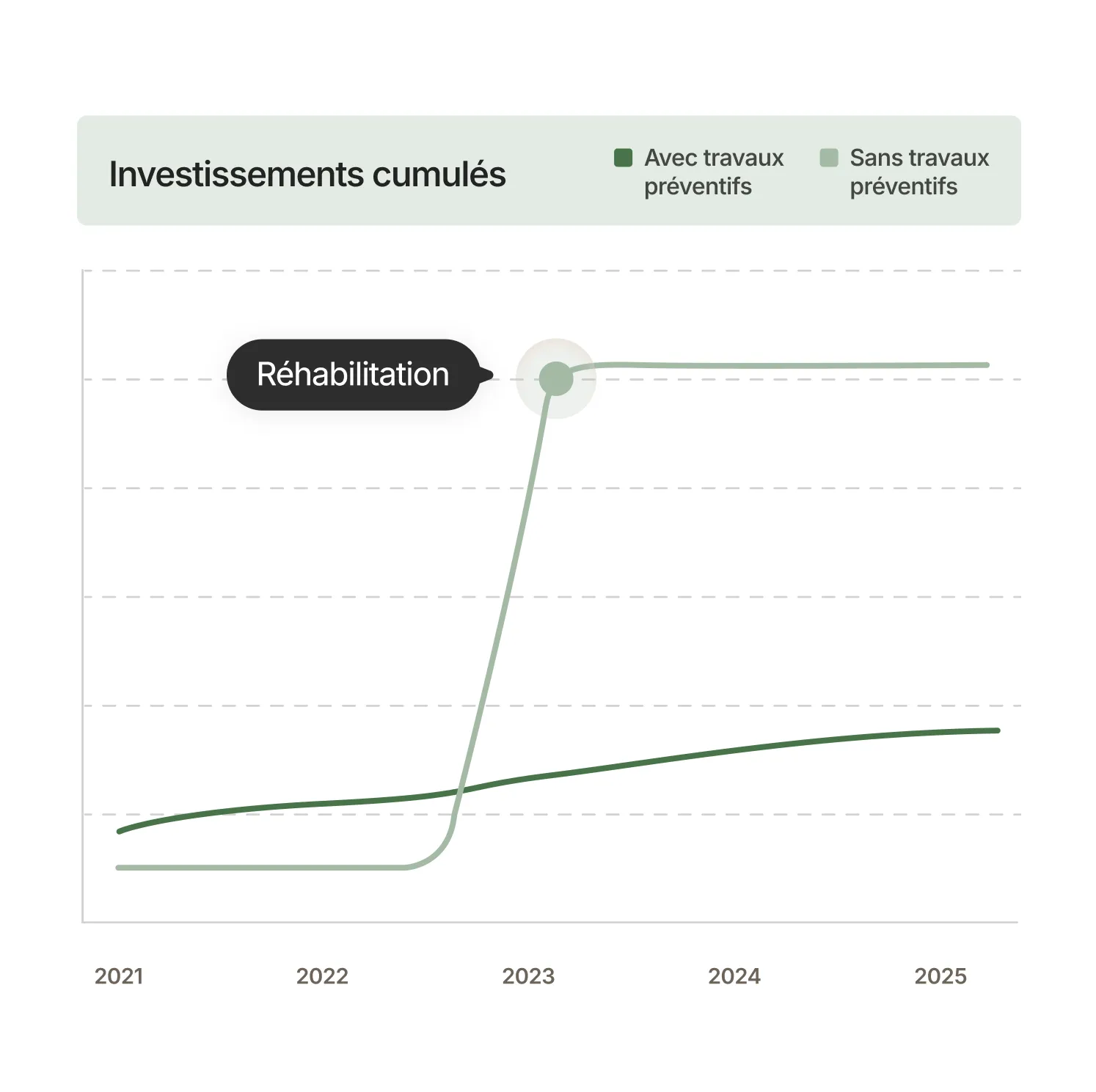 Grâce à nos modèles exclusifs de vieillissement, comparez facilement le coût de l’inaction avec l’ensemble des coûts et gains liés aux travaux préventifs.