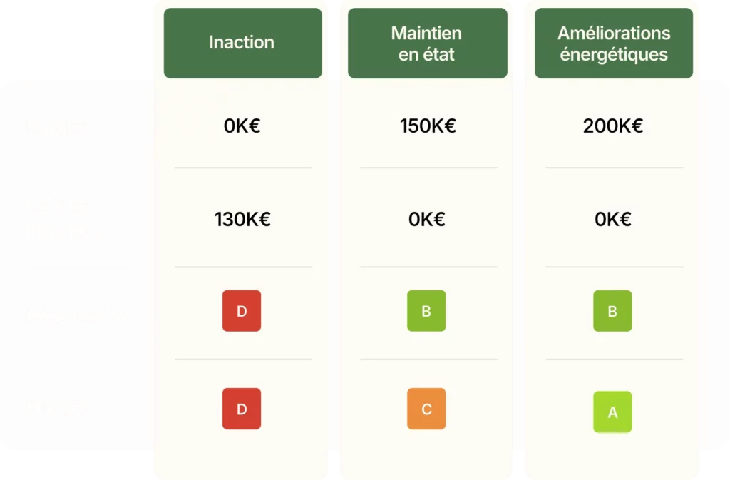 Faire un plan de travaux chiffré. Calculer l’impact actuel et projeté du vieillissement et de différents travaux sur chaque bâti.